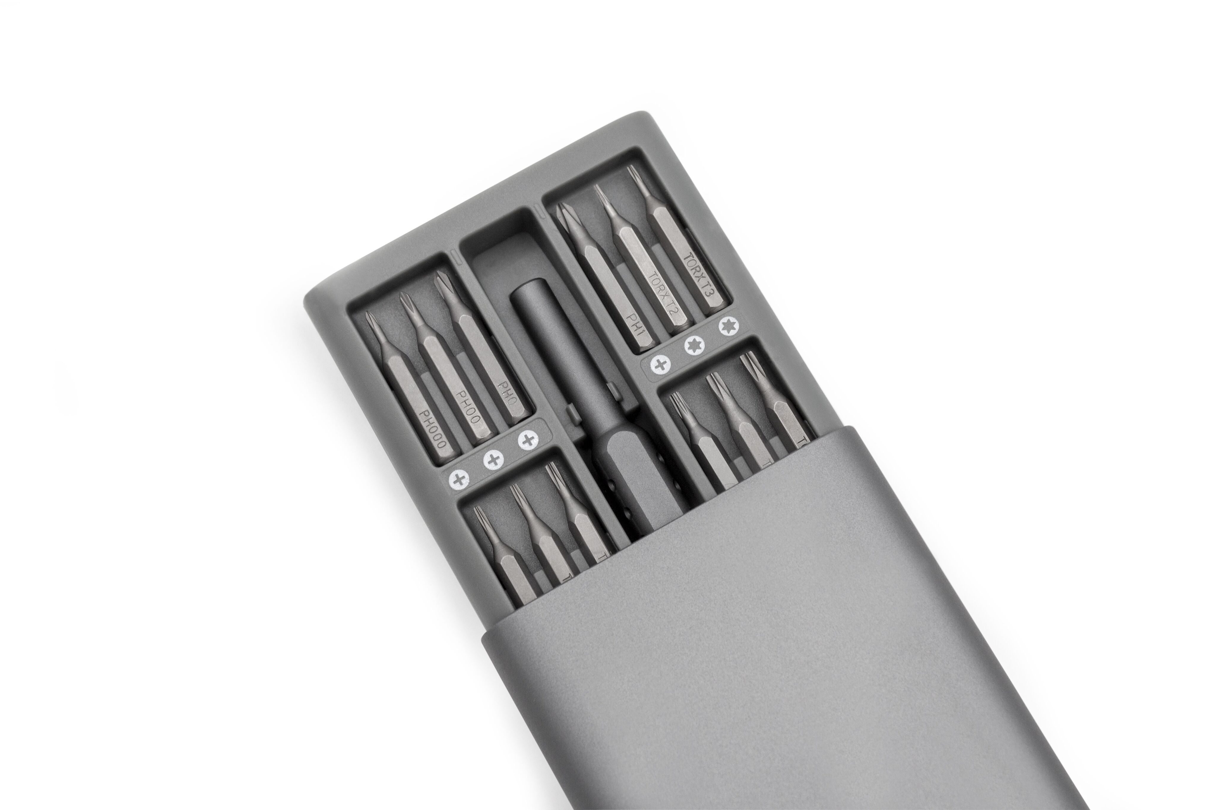 Набор высокоточных отверток для ремонта смартфонов, планшетов, ноутбуков (включая iPhone, iPad, MacBook Air и MacBook Pro), а также игровых консолей Nintendo, PlayStation и Xbox. Включает в себя 24 магнитные прецизионные биты из прочной стали S2 (твердость HRC 58–62). Эргономичная алюминиевая ручка с анодированным покрытием и противоскользящей вращающейся крышкой. Удобный алюминиевый кейсс с пружинным механизмом и магнитным основанием.