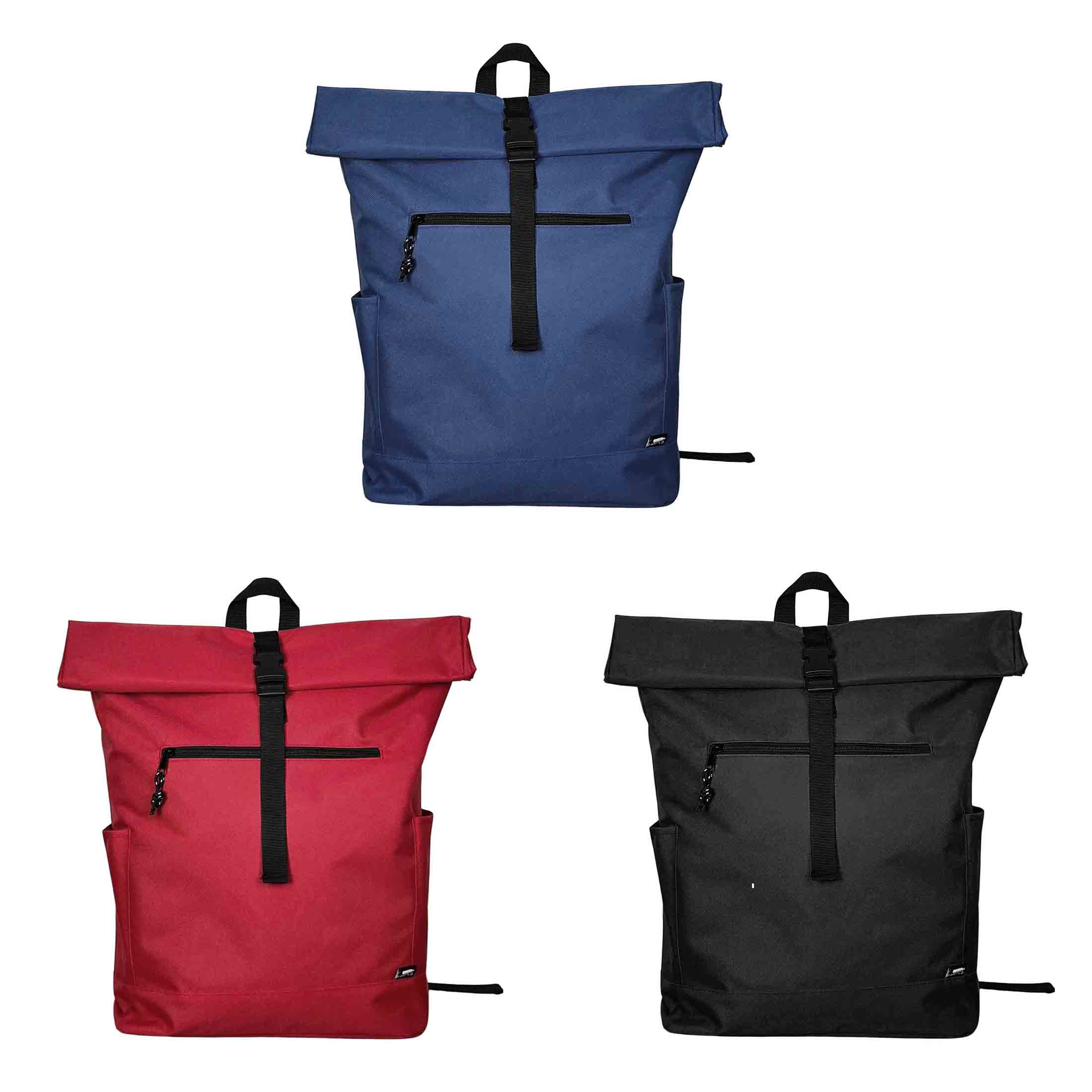 Рюкзак из переработанного пластика (RPET). Система roll-top скручивания верхней части позволяет регулировать объём и обеспечивает дополнительную защиту содержимого от влаги и пыли. Имеет фиксацию основного отделения на застёжке, вместительное внутреннее пространство с мягким карманом для ноутбука или планшета, передний карман на молнии, боковые карманы для бутылки и мелочей. Выполнен из прочного износостойкого полиэстера 600D. Размер 32 x 13 x 45-60 cм